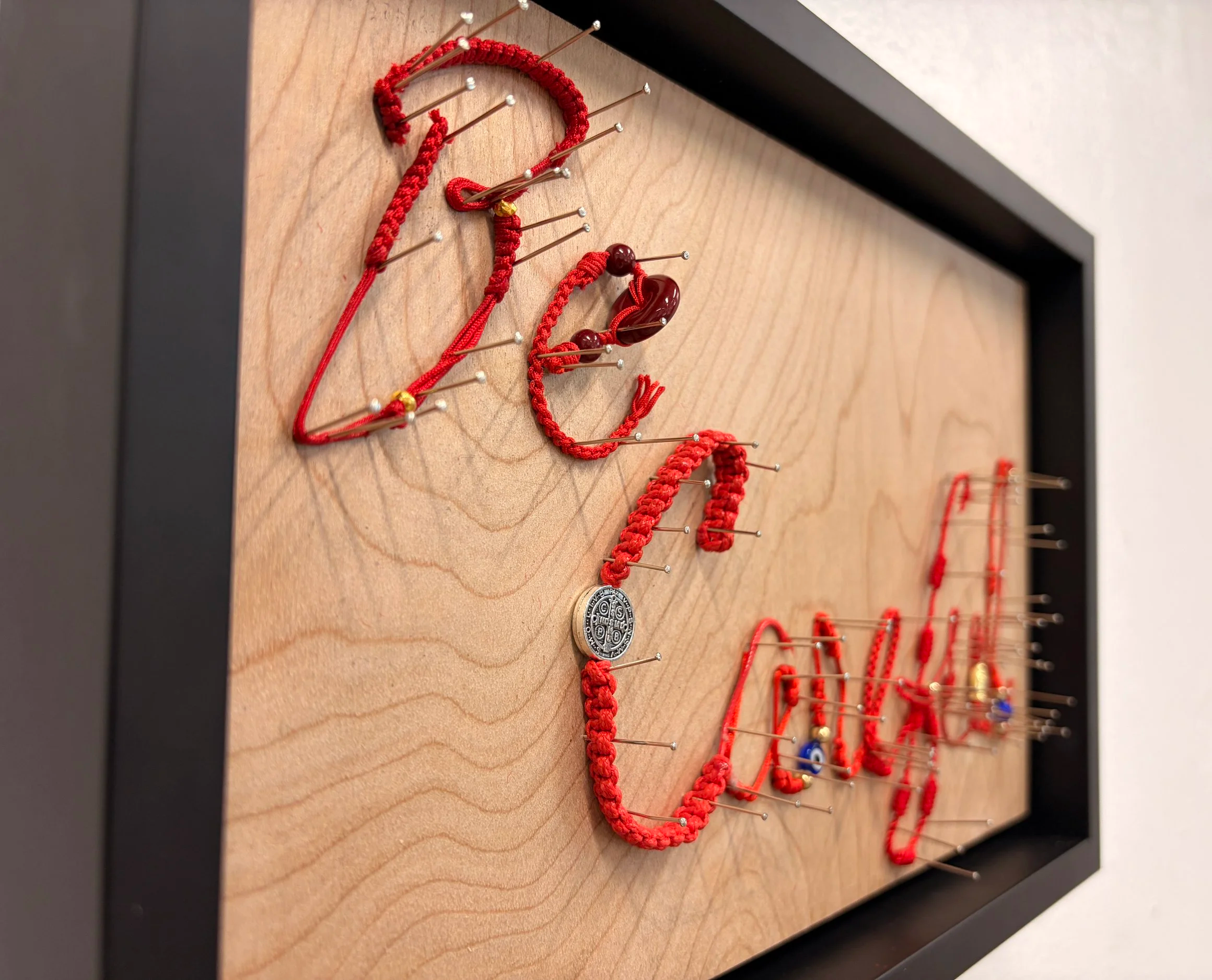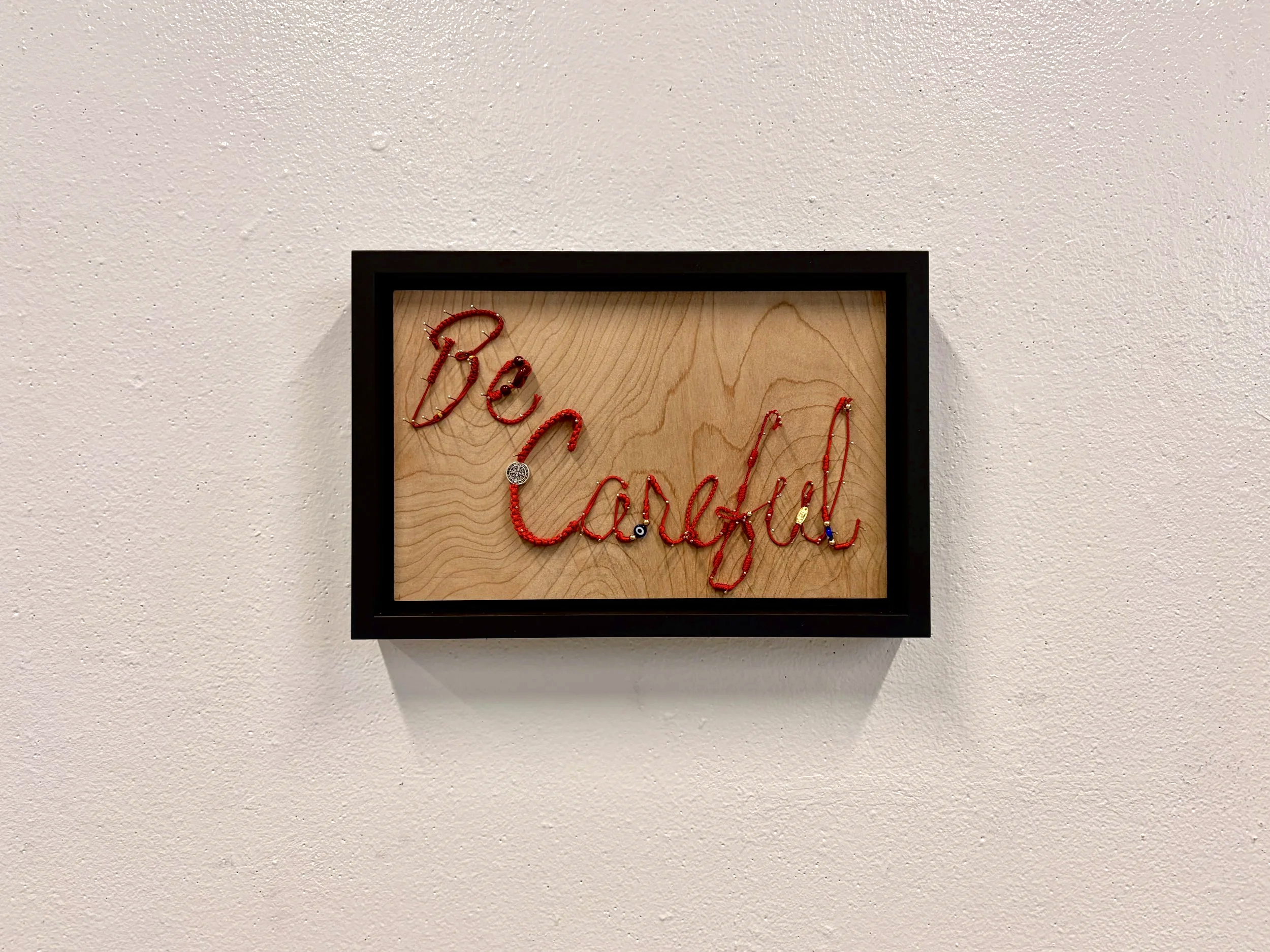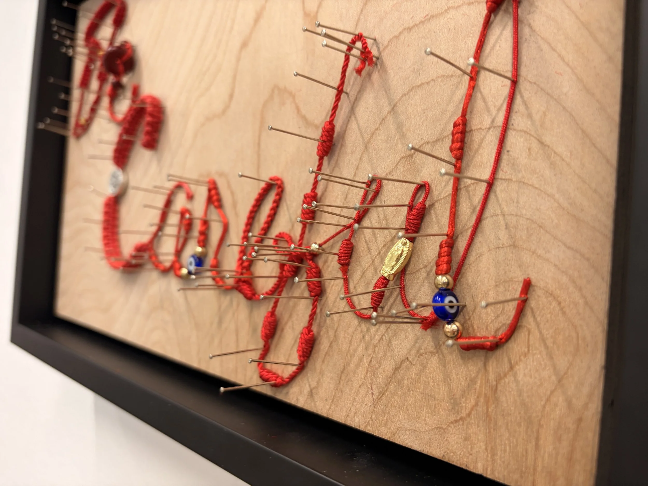 My piece was inspired by a phrase my parents say before we leave. I used old red protection bracelets because loved ones often give them for safety.